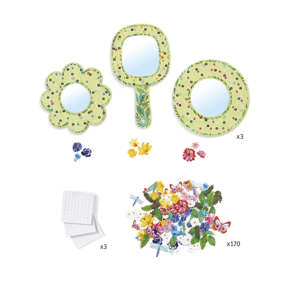 Decorate the 3 small circle acrylic mirrors with the provided flower and leaf foam stickers that children can overlay to look like a wreath. Great for playdates, school holiday activities, birthday parties or crafting days.