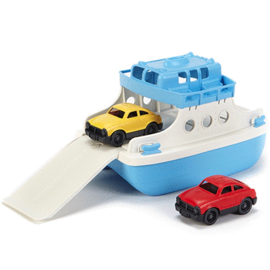 Set sail with the Green Toys Ferry Boat for a quick bathtub excursion or an extended trans-pool voyage. Whatever the adventure, this two-story vessel is ready to hit the open water with room for eco-friendly cargo galore, and even comes with two Green Toys Mini Fastbacks. Use the slide-out ramp to load up the spacious bottom level that accommodates up to four Green Toys cars. The open top deck features two small benches on each side, as well as eleven windows looking down into the main level. Made in the USA from 100% recycled plastic milk jugs that save energy and reduce greenhouse gas emissions, this craft is ideal for any body of water - durable, buoyant, and dishwasher safe. The hull also detaches for easy cleaning.