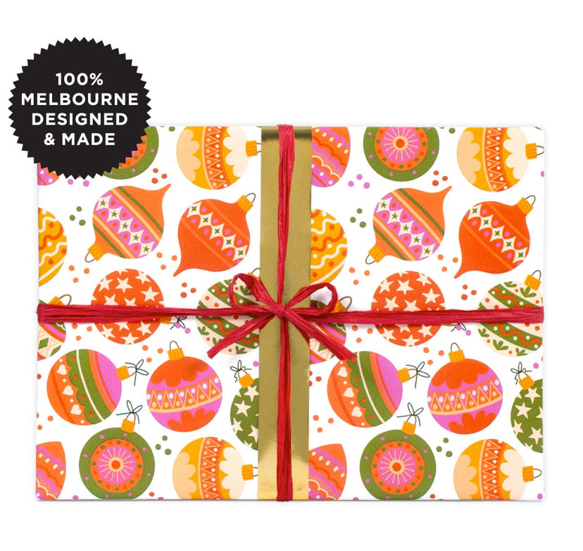 Baubles is a fun and festive Christmas design featuring red, orange, hot pink, yellow and nude tones on white semi gloss wrapping paper.