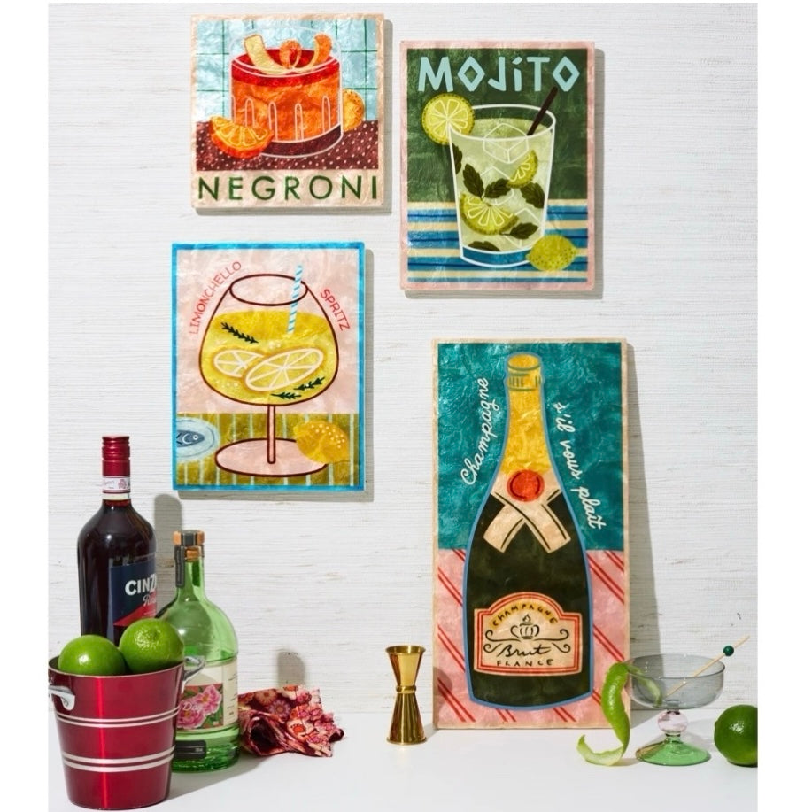 Fresh, fizzy and full of minty goodness. Our Mojito cocktail tile is a nod to your favourite summer sip, complete with lime wheels, mint sprigs and striped retro vibes. Hand-painted on capiz shell with that signature mother of pearl shimmer of ours.