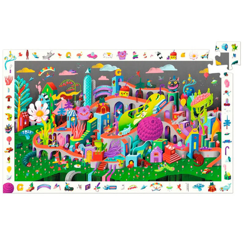 A 200-piece observation puzzle revealing a fantastical city with crazy characters flying around. Put the puzzle together and have fun finding items from the border in the main picture.