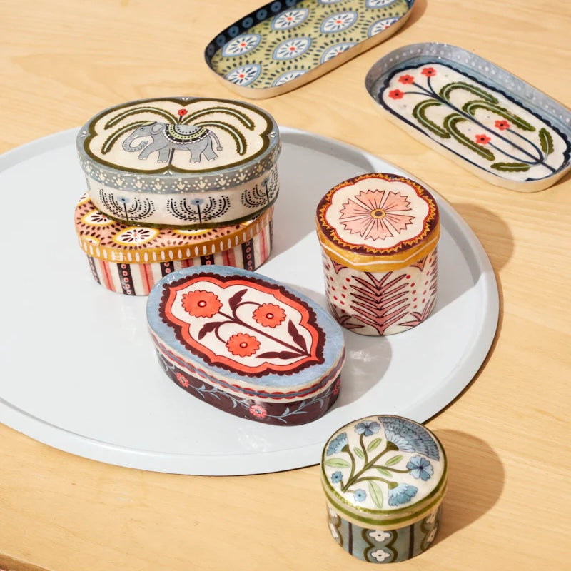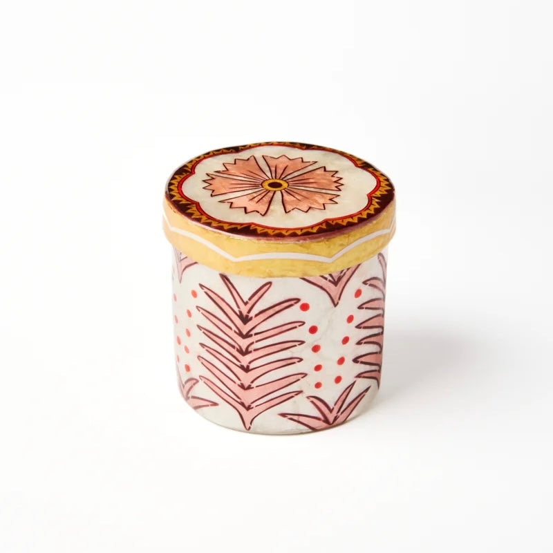 Compact and versatile, the Samira Short Box Blue Flower is a hand-painted capiz shell trinket box decorated with a delicate blue floral motif. Perfect for rings, earrings, or small keepsakes, it fits neatly on bedside tables, vanities, or shelves. Both decorative and practical, it's an easy way to add artisanal craftsmanship to your everyday. Makes a perfect gift.